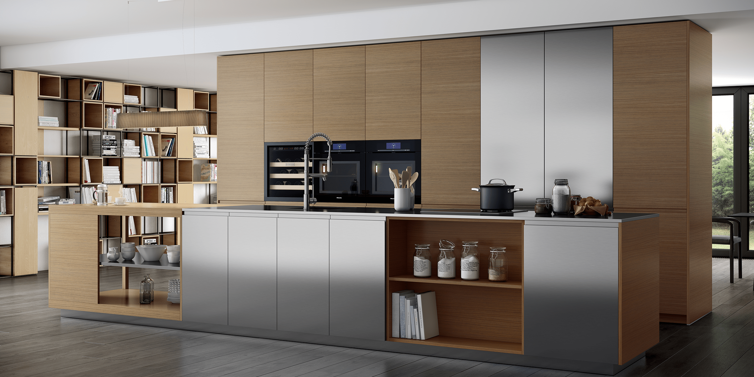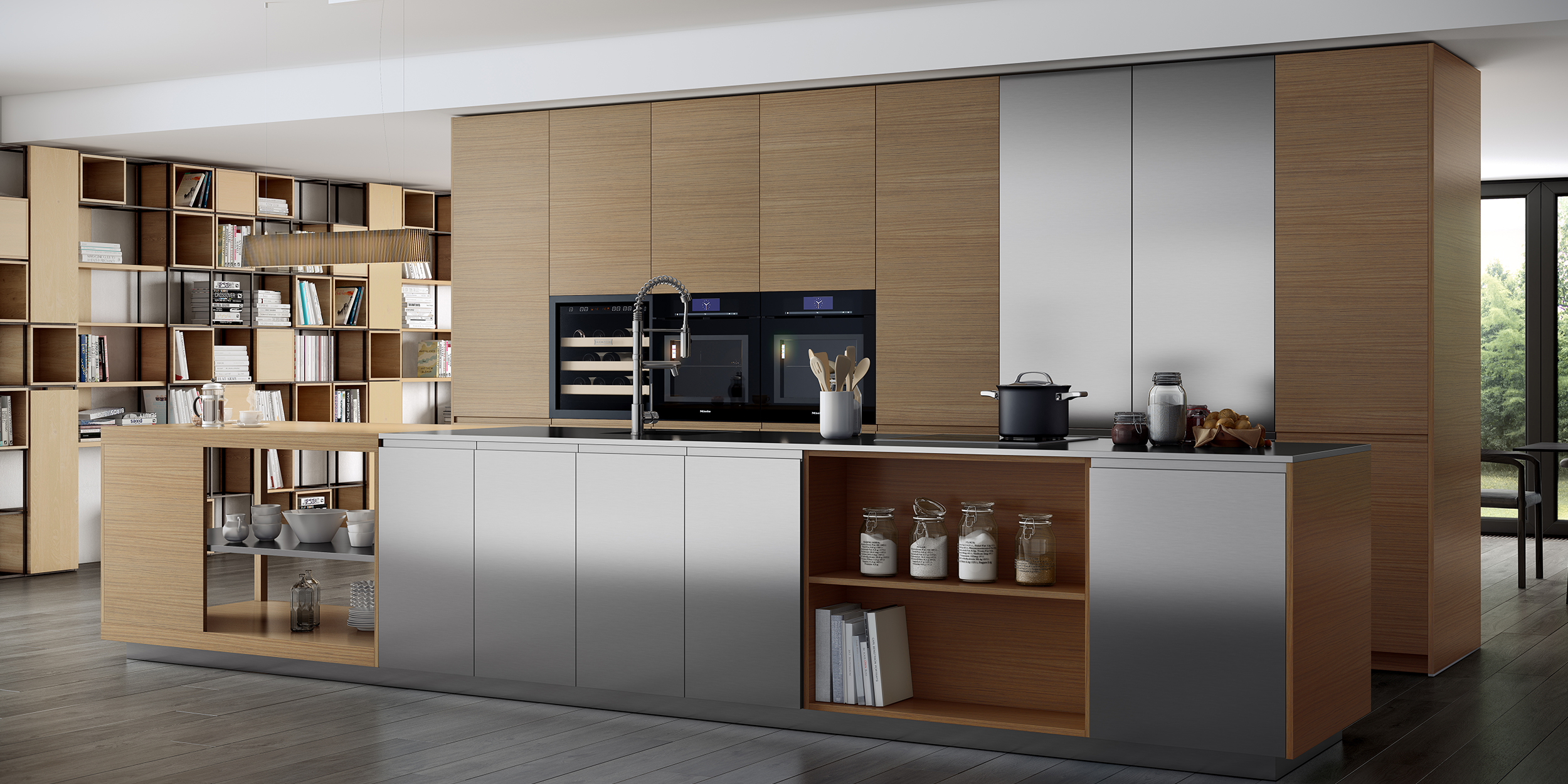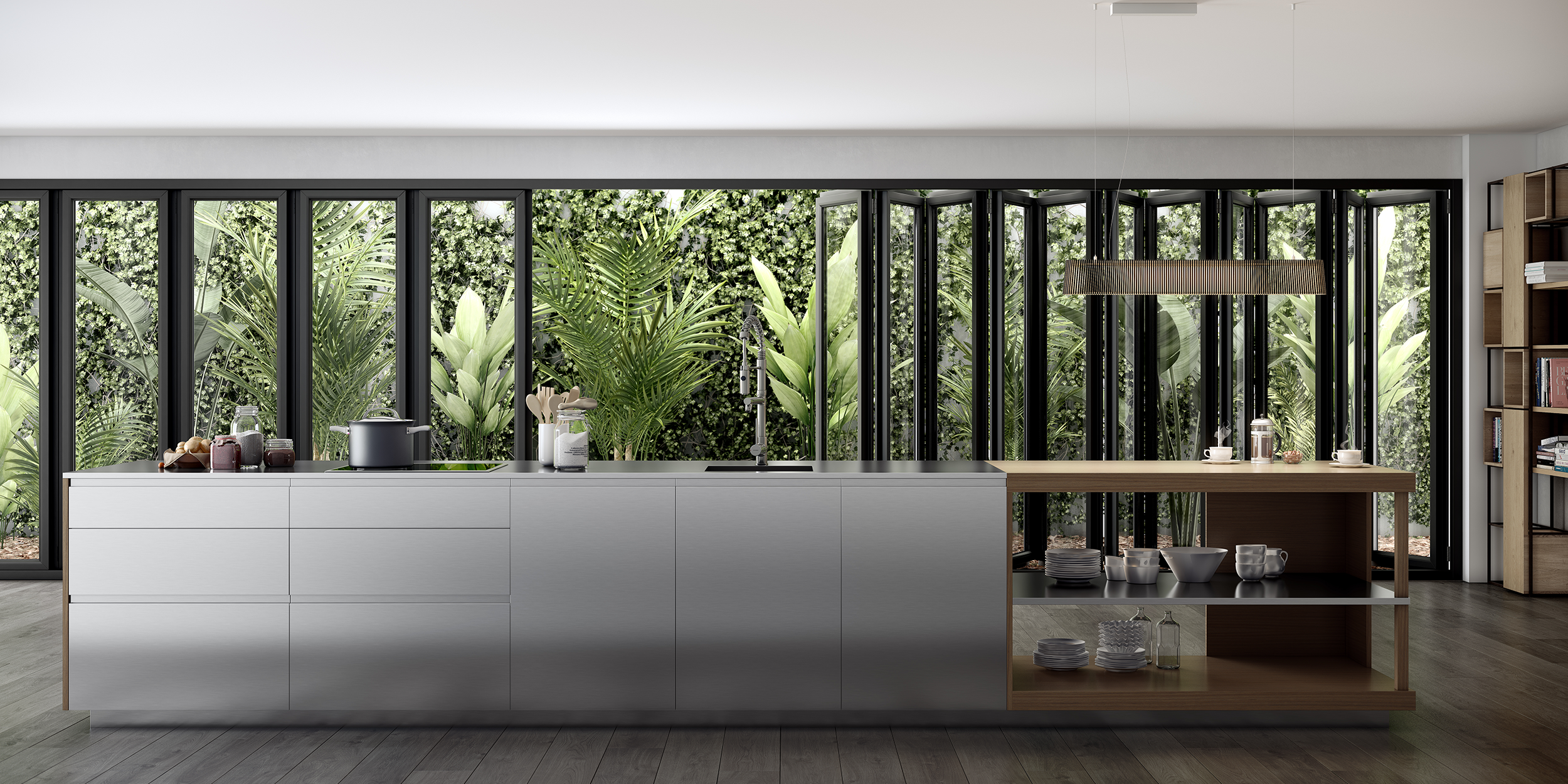 Métrica Inox has a totally exclusive front – robust, easy to maintain and of great beauty. Wood and steel are proposed as the best combination of materials for the very demanding of lifestyles. The oak wood columns bring balance, in contrast to the sobriety of the stainless steel.