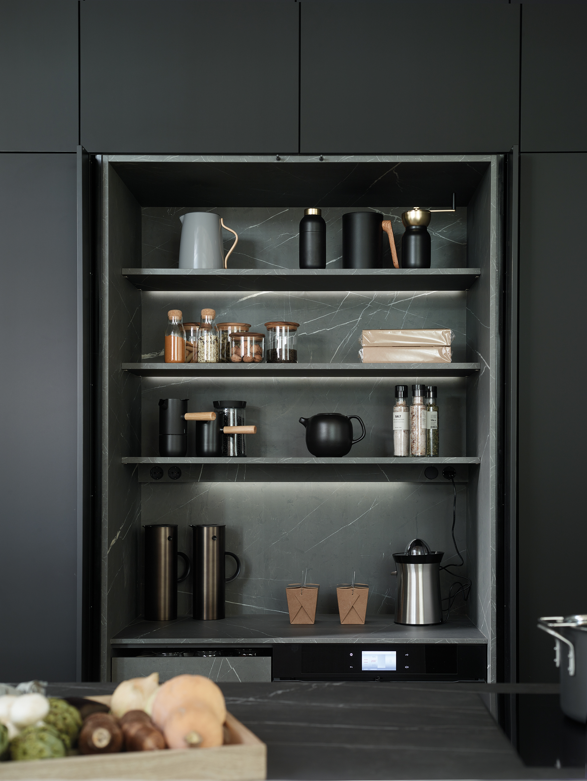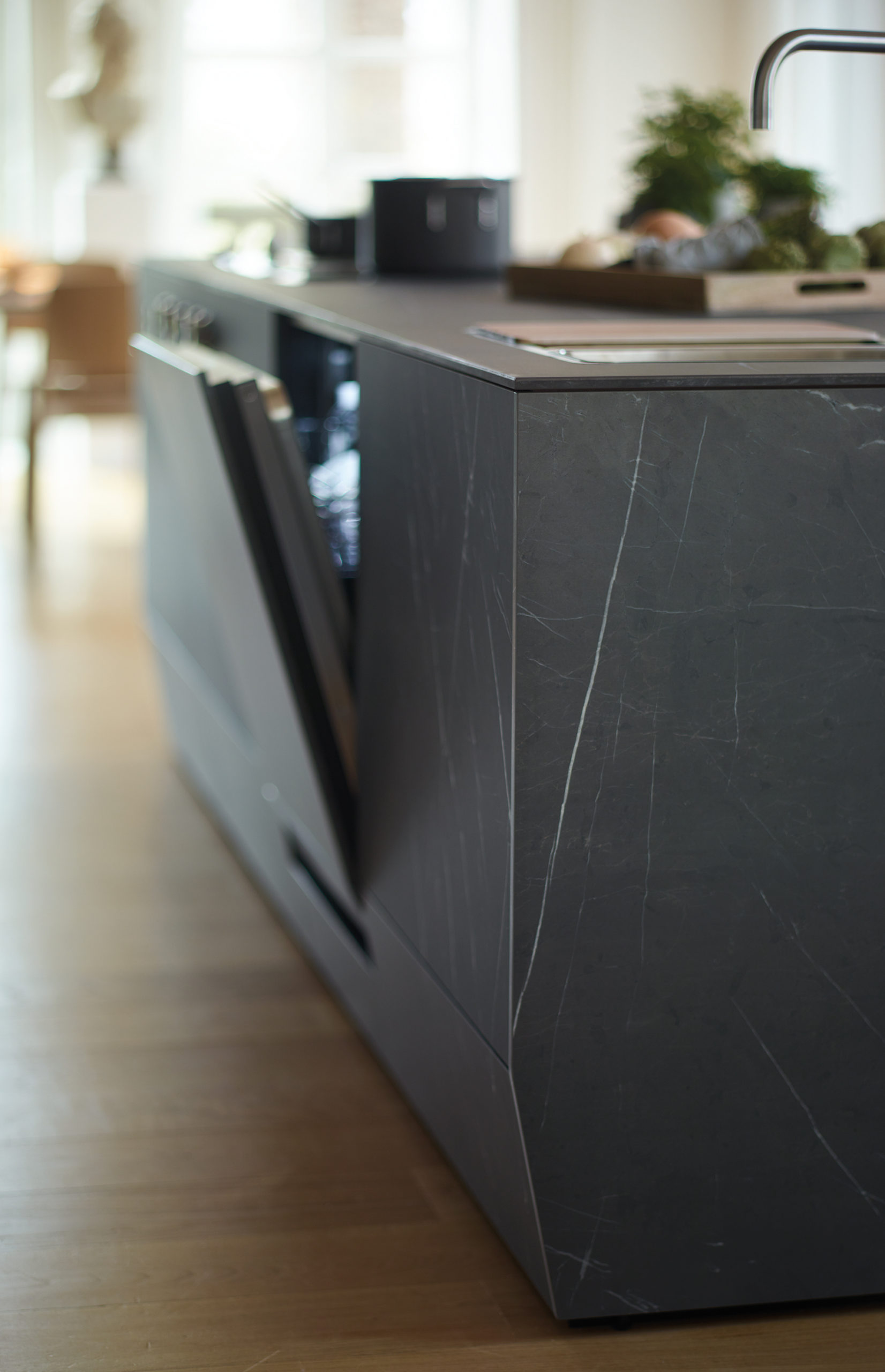 The fully open-plan kitchen is boldly located right in the centre of the house. From this privileged position, the kitchen acts as a vital link between the dining room and living room, distributed perpendicularly at each end. In this style, the barriers of a conventional kitchen are broken down, allowing for a more unified space to share and enjoy. This approach offers a greater sense of spaciousness, favouring interaction and freedom of movement between people.